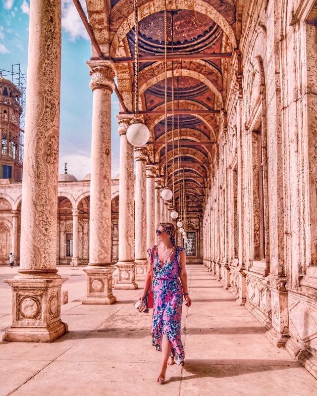 After exploring the museum at a snails pace due to the dozens of selfie requests from the kiddos, we Uber’d over to the Mosque of Muhammed Ali. Our Uber driver dropped us off behind the site where there was no entrance, so we walked 1.5 miles around to the front, reminding me that Egypt love tourists! The mosque is open to the public and Jenna was able to take photos without covering up, so it was a win-win. The mosque sits atop a hill with some swell views of Cairo.